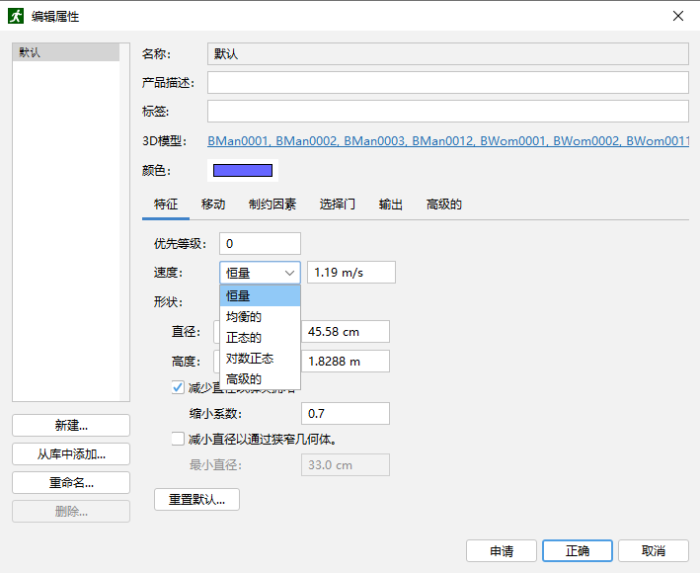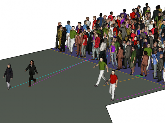 在现实世界的行人移动场景中,不同比例的人口会使用楼梯或自动扶梯。此外,一部分人会在自动扶梯上行走,而其他人会站立。此示例模型演示了 Pathfinder 中的一种方法来对这些百分比和运动特征的差异进行建模。